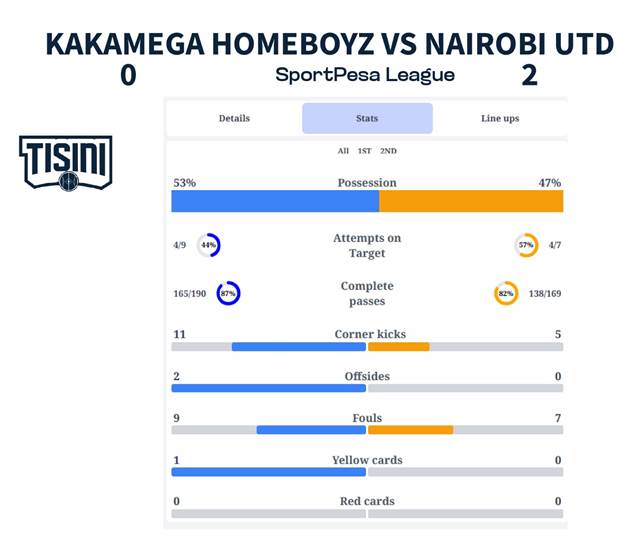 Kakamega Homeboyz took control of the ball in the second half, racking up 54% possession while the visiting Nairobi United team sat back to defend deep in their own territory.