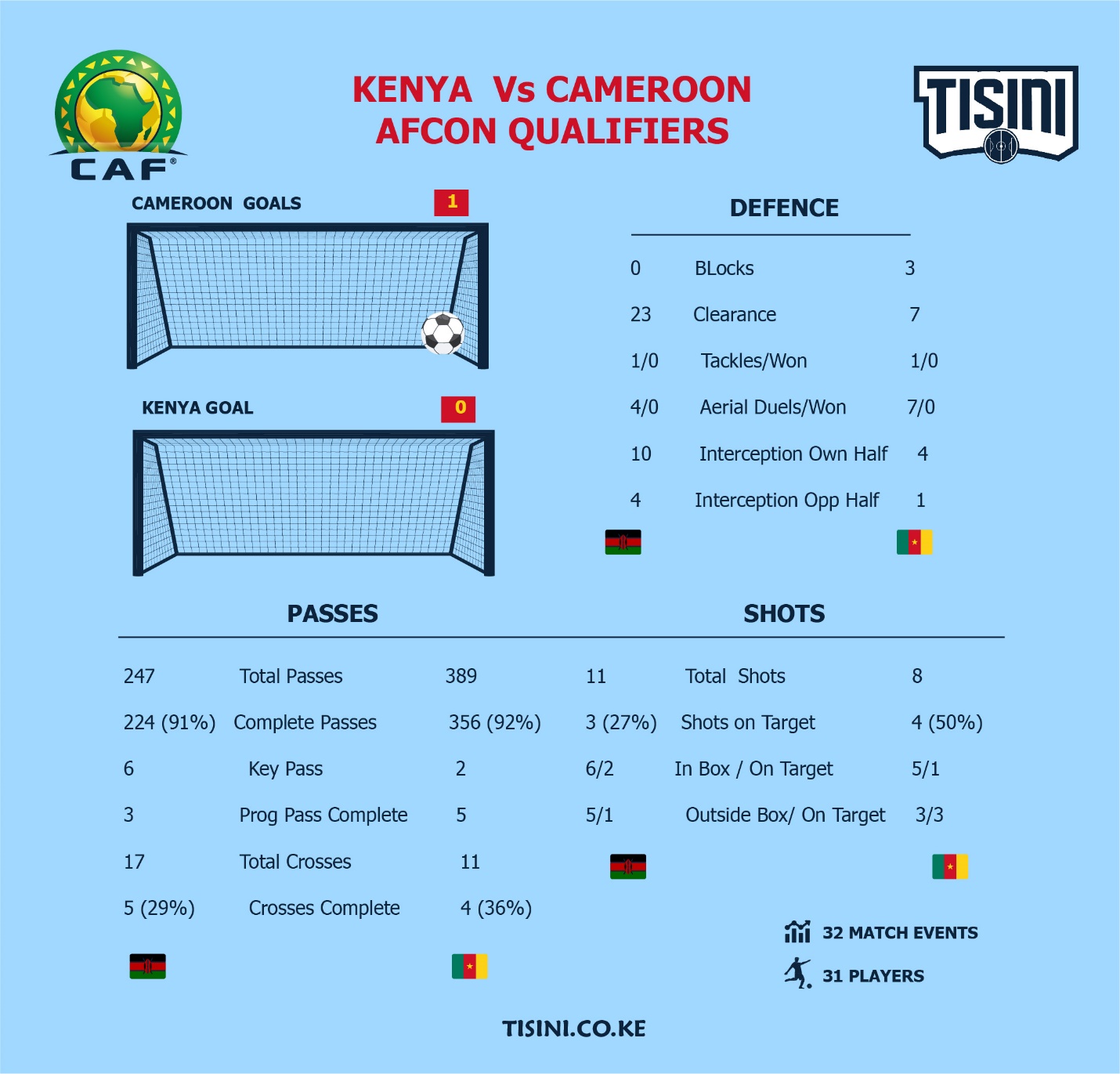 In a match played in Kampala on Monday, Harambee Stars lost by a single goal to Cameroon. This score line was a huge improvement from the Friday fixture in Yaoundé, where the Stars conceded four times and scored ones. Tisini tracked key events during the match and data collected reveals that indeed, the Kenyan men’s national team side did put up a better fight.