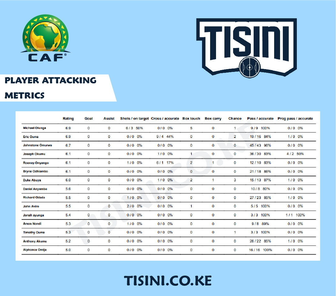 Eric Ouma led the team in crosses, attempting 9 and successfully completing 4 of them. This means, of Harambee Stars' 5 accurate crosses, Eric Ouma delivered 80%. The other accurate cross was by Rooney Onyango who attempted 6 in the whole game. All of Kenya's crosses from the left side were delivered by Eric Ouma. Duke Abuya and Joseph Okumu each contributed one cross from the right side, while Rooney delivered the remaining six.